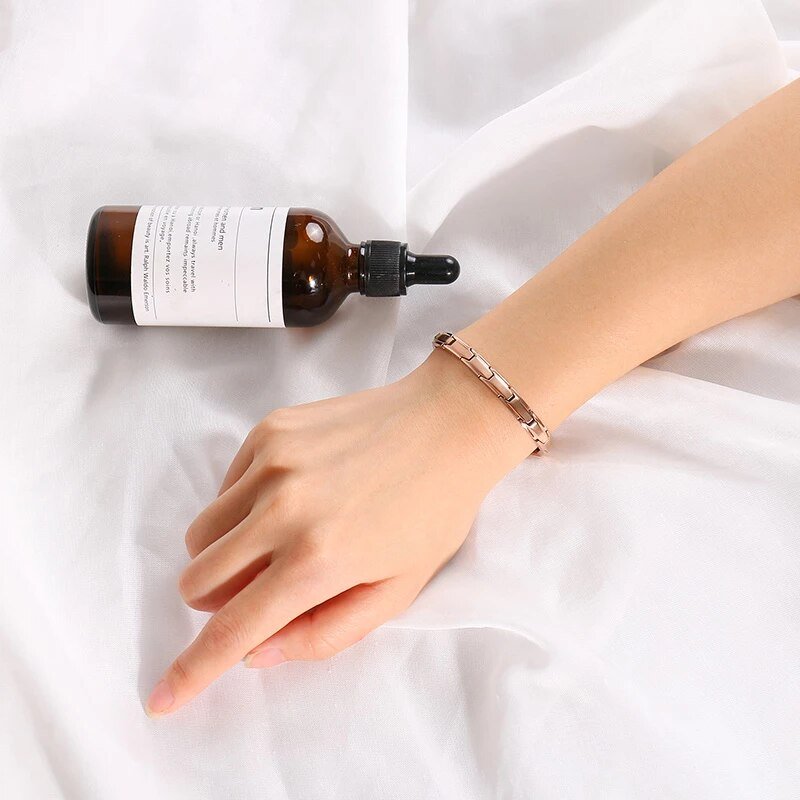 Combina Estilo y Bienestar con Nuestra Pulsera de Magnetoterapia Alemana de Acero Inoxidable Rose Gold con Cubierta de Oro Ionizado de 14K.