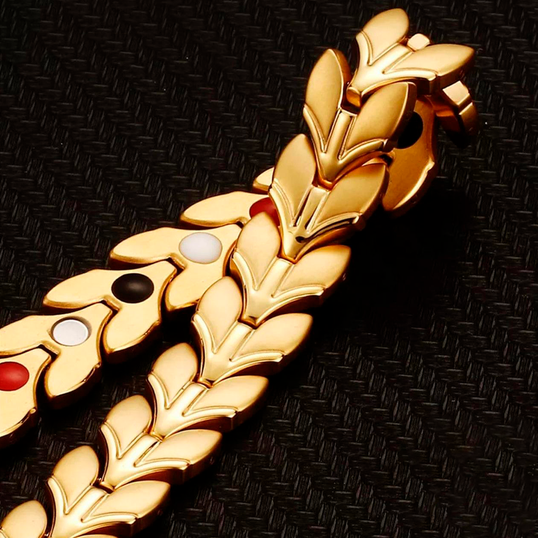 Descubre la fusión perfecta entre moda, elegancia y bienestar con nuestra pulsera de magnetoterapia especialmente diseñada para mujeres. Fabricada con acero inoxidable grado quirúrgico 316L en un deslumbrante color dorado y adornada con un diseño de laurel, esta pulsera es una obra de arte que combina estilo y los posibles beneficios de la magnetoterapia. Además, cuenta con una cubierta de oro ionizado de 14K que añade un toque de lujo y sofisticación. Importada directamente desde Alemania, un país famoso por su excelencia en calidad y precisión, esta joya es una declaración de moda que también puede contribuir a tu bienestar.